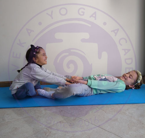 در این بازی یوگایی دونفره، دو کودک روبهروی هم در وضعیت باداکون آسانا (پروانه) مینشینند.